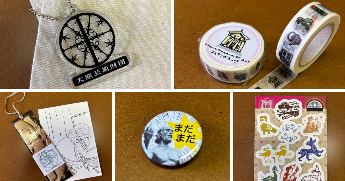 本館の丸窓をイメージしたオリジナルアクリルキーホルダーや児島虎次郎記念館に展示されているエジプト・フスタート出土陶磁器片をモチーフにしたオリジナルステッカーなど、どれが当たるか運試し!